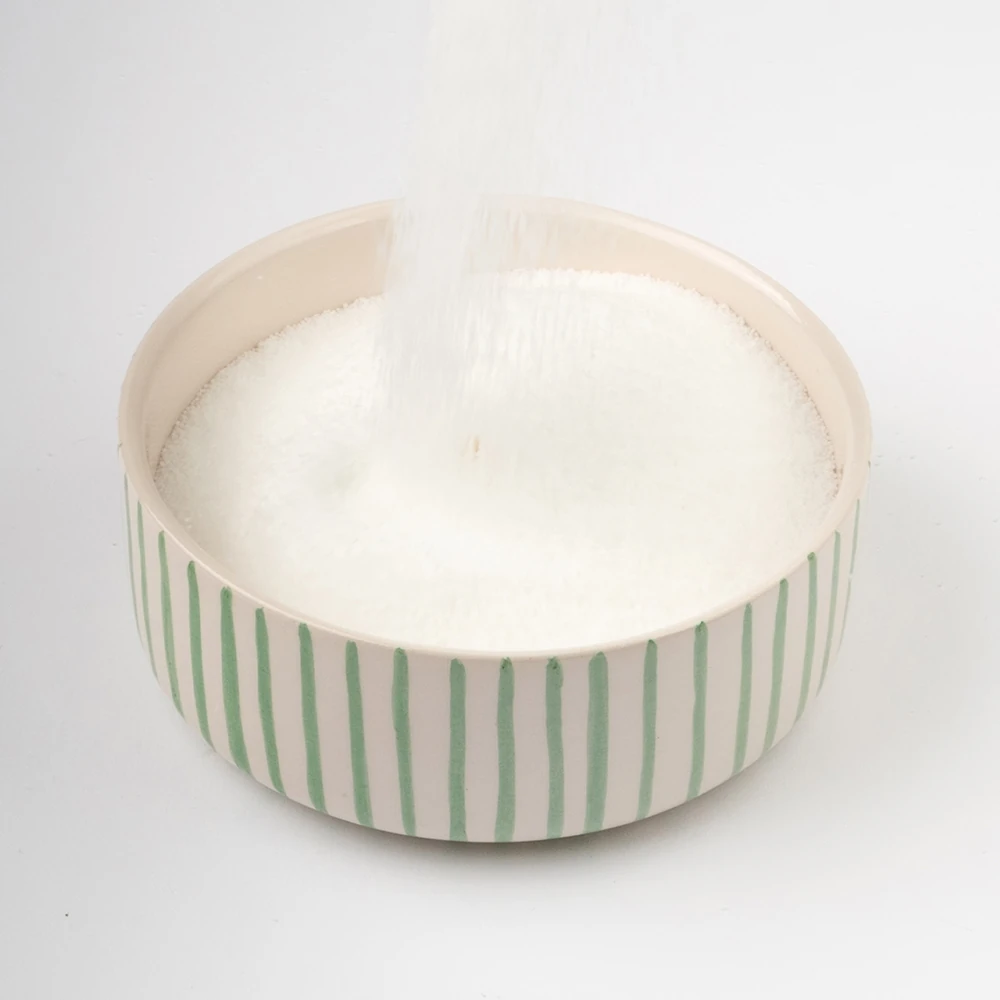 Lush Lines, ince yeşil çizgili seramik kasesi ve beyaz toz mumuyla hem sade hem dikkat çekici bir görünüm sunar.